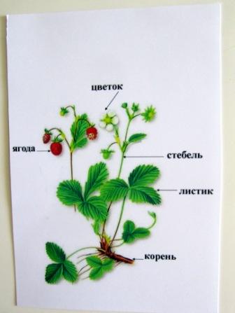 Утро началось с такой картинки, которую мы подробно рассмотрели,что-то Кирилл рассказал сам (что это земляничка, у нее есть листочки, цветы и ягодки). Мама показала корень и стебель и рассказала цикл созревания ягодки