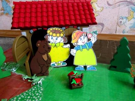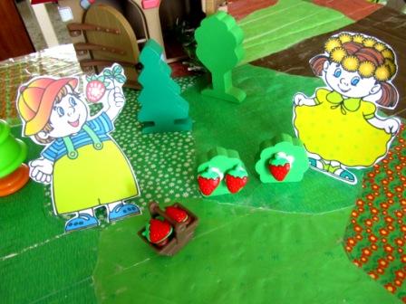 Потом приступили к самому интересному. Это Сказка, конечно про земляничку, в сказке заострили внимание на то, что сначала на кустиках появляются цветы, только через некоторое время ягодки.