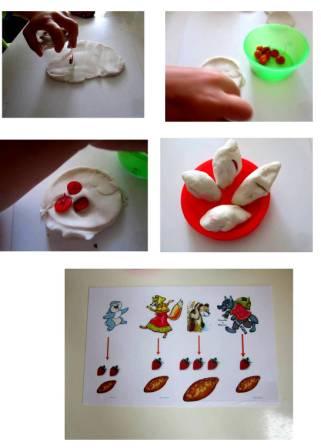 Пирожки лепим по инструкции,которую дал Медведь,в один самый большой ложим 3 ягодки, другой маленький - 2 ягодки и 2 одинаковых-по одной ягодки