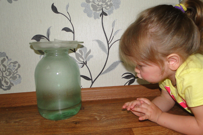 В следующем опыте попытались сделать облако - не получилось, зато узнали как испаряется водичка , что она бывает в 3-х состояниях вода, пар и лед, и что водичка с земли испаряется, поднимается в небо, и возвращается назад дождиком (капельки конденсата):
