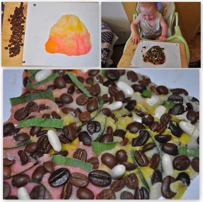 Кофе. А еще мы делали муравейник из кофе. Ах, какое ароматное творческое задание. Сначало наслаждались запахом кофейных зерен, потом долго объясняла - что их есть ненужно, а потом клеили зернышки на самоваренный пласелин. Украсили листиками и фасольками. Красотааааааа))