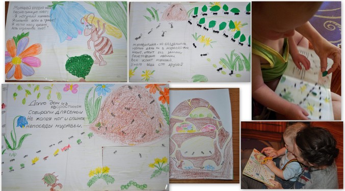 Муравьинная книга: Чего нам в жизни с Артёмом не достает, так это книг, о чем я постоянно горюю и жду возвращения в Россию. Но погоревали и хватит, нужно же выход искать. Думала распечатать, но в нете нашла только сканы "муравей Ферда" - а она для детей постарше. В общем решила нарисовать сама. Получилась книга в три разворота. На первом сюрприз - Муравьи под вязаным листочком, который Артем либо наровит оторвать либо играет в "куку", второй разворот - бисерные муравьи несут листочки. Листочки сам Артём клеел (они из двустороннего скотча, но одну сторону которого наклеила зеленую бумагу), правда без психов сначала не обошлось - не нравилось как прилипают они к коже.. Во время чтения этого разворота, он их периодически отдирает и снова наклеевает. Третий разворот демонстрирует муравейник и его внутреннее устройство. Написала стихи про муравьев. Думаю, Артему понравилось - потому как минут по 10-15 он ей точно увлекался за раз)))