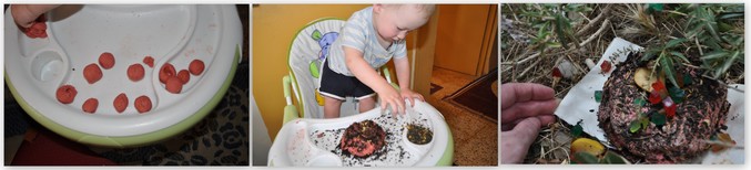 Делаем домик для муравьев: На этот подвиг нас впечатлила Ольга. Делали мы из соленого теста покрашенного зеленым и красным красителями. Катали шарики (я) - потом складывали горкой. Посыпали кофейной гущей и заваркой. Сушили на солнце день и в духовке 1 час при темп. 80 градусов. Это могло бы стать замечательной сенсорной коробочкой, но так как игрушечных муравьев не нашла и не придумала чем их заменить, решили заселить настоящими - отнесли к муравьинным тропам, прикормили цукатами. Даже застали одного разведчика, но видимо местные муравьи привыкли жить в подземных норках, наш домик так и остался незаселенным)))