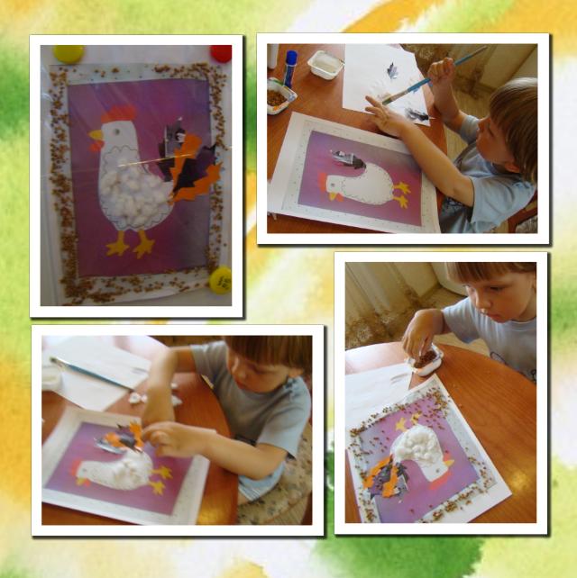 - Курица (шаблон, клей ПВА и клей карандаш, гречка, вата, перья вырезанные из журнала)