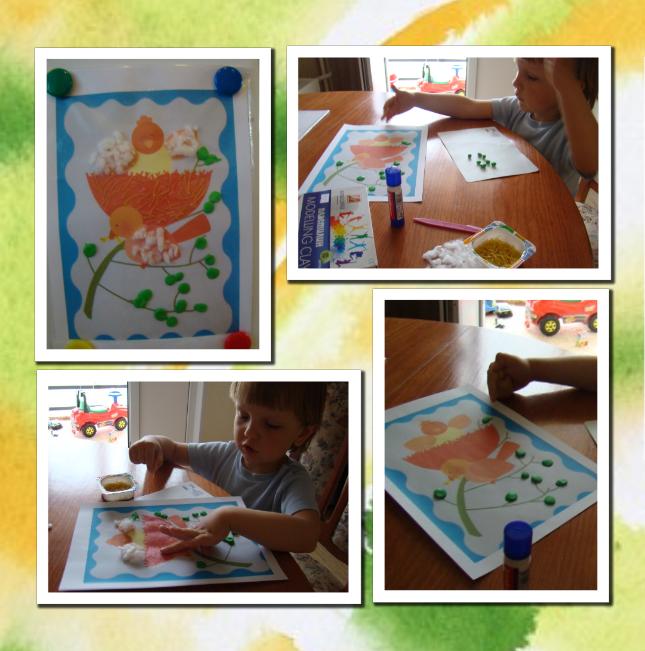 - Птичье гнездо (шаблон, пластилин зеленый, вата, клей карандаш, вермишель)