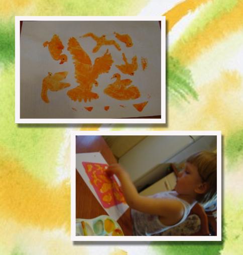 За завтраком посмотрели презентации о птицах, поиграли в лото и отправились в зоопарк, смотреть птичек. Птички нас в зоопарке не очень заинтересовали, конечно, там ведь белые медведи плавают, кроме них нам и никого и не надо, а мама тут с птицами пристала. Весь день прогуляли, вечером сделали попугайчика, рисовали с помощью трафарета птичек и почитали книжки о тропических птицах.