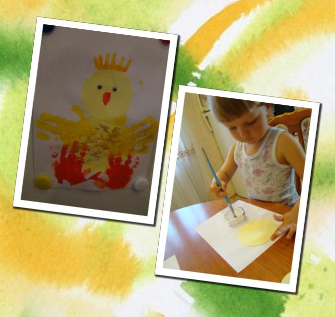 - Цыпленок (два круга вырезанных из цветной бумаги, клей ПВА, краски, хлопья овсяные)