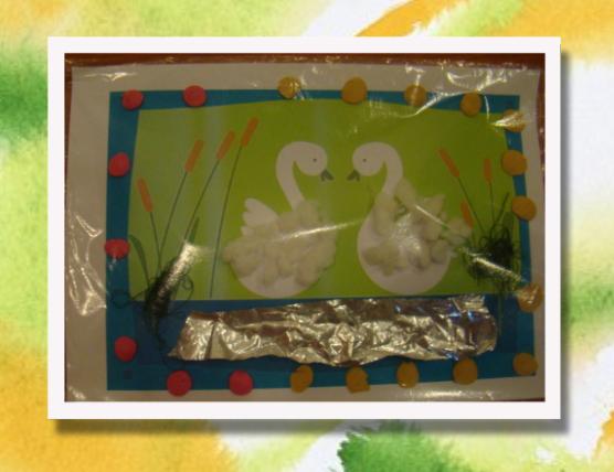 - Лебеди (шаблон, нитки зеленые, вата, фольга, пластилин, клей карандаш)