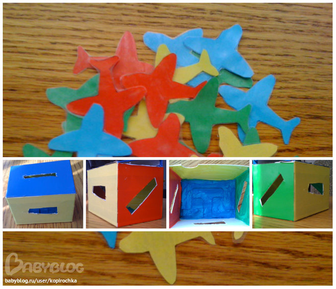 Самолетики нарисовала, вырезала, заламинировала и снова вырезала. Стороны коробки обклеила, прорезала дырочки, и