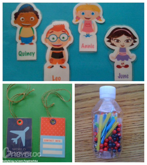 И еще одна завлекалочка для Дашиных пальчиков: баночка из под спирта с дырочкой в крышечке. В эту баночку нужно засунуть бусинки и палочки. Дома Даша может этим увлечься на долго. Надеюсь и в самолете тоже.