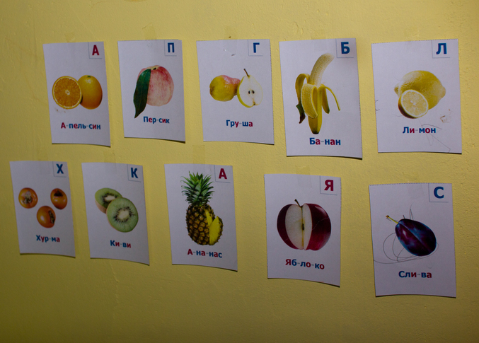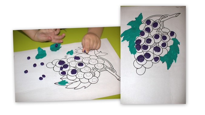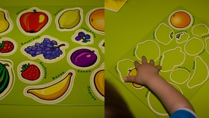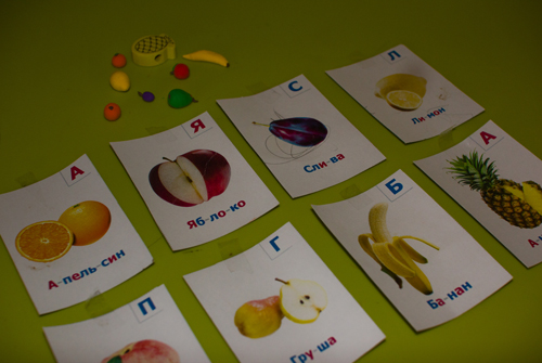 Еще одним заданием было разложить на соответсвие фигурок и картинок. Тёмка забрал у меня все фигурки фруктов и убежал))))))))))))