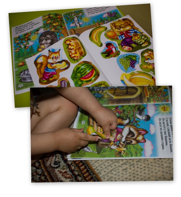 По книжке с наклейками, читали стишки и приклеивали соответствующие наклейки. Тёмочке это задание нравится, но клеит он их куда попало)))