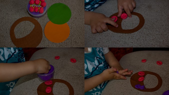 Лепили ягодки: малинки и чернички, складывали их в корзиночку, считали, потом эти же ягодки раскладывали по тарелочкам, повторяли понятие: один -много-ни одного!