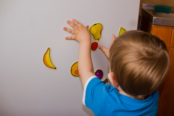 Развесила я картинки, пока только с фруктами, Тёмка сразу же заинтересовался и начали мы их повторять: я называла, а Тёмка не пальчиком показывал, а срывал нужную картинку и давал мне, а потом я ему еще раз называла, а он приклеивал обратно)))
