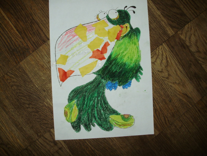 В итоге получилась очень красивая, яркая птичка. Я ее не прячу, сегодня ванюха ее нашел, носил, а я напоминала, как мы вчера ее делали. Будем продолжать знакомиться с "рваной" аппликацией на даче.