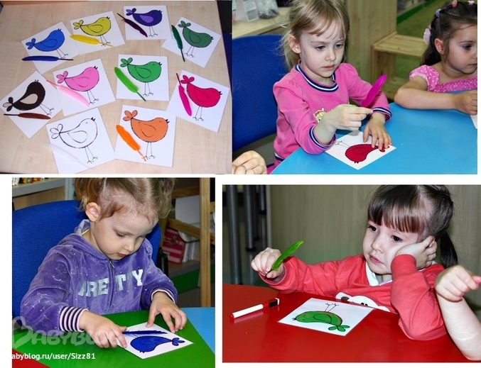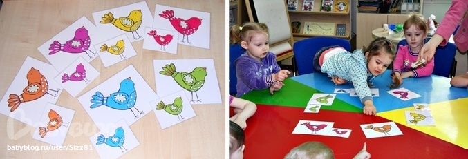 Птички потеряли свои пёрышки, а дети помогали найти (у каждого ребенка была карточка с цветной птичкой)