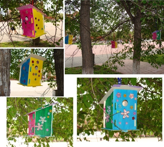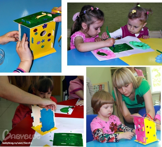 Делали общую поделку-скворечник, дети сами красили части скворечника, а потом украшали цветочками и бабочками: