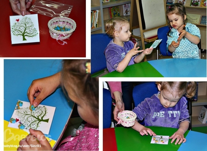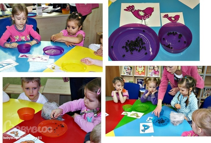 Потом каждой птичке и птенчику находили чашечки по цвету (птичке-большая тарелочка, а птенчику маленькая). А затем насыпали им корм (в большую тарелку (для мамы-птички) нужно насыпать корма больше, чем птенчику).