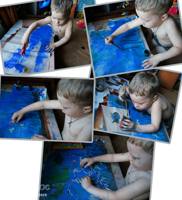 Нашли наш ФОРМАТ. Намного удобнее, чем на А4. "Долгоиграющая" картина. Можно каждый лень что-нибудь дорисовывать, приклеивать что-то новое. На нижнем фото зеленый осминожек - обвели ладошку на цветной бумаге, вырезали. приклеили. А потом стали из спичек рыбок, скатов, кораблики собирать