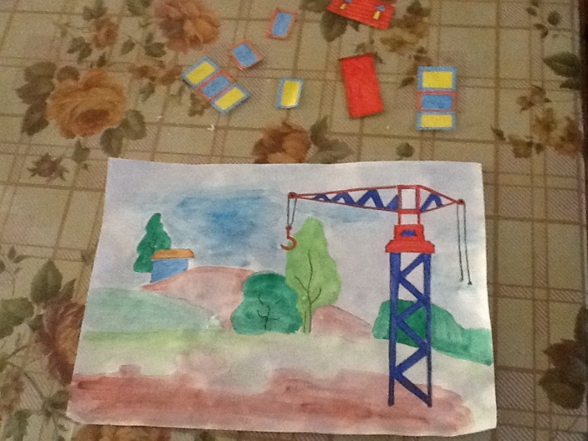 Следующая наша поделка с краном была уже после сна прогулки обеда. Это была аппликация, строили мы дом, получилось так что Вадим к этому времени уже начал капризулить , но мы все таки его построили.