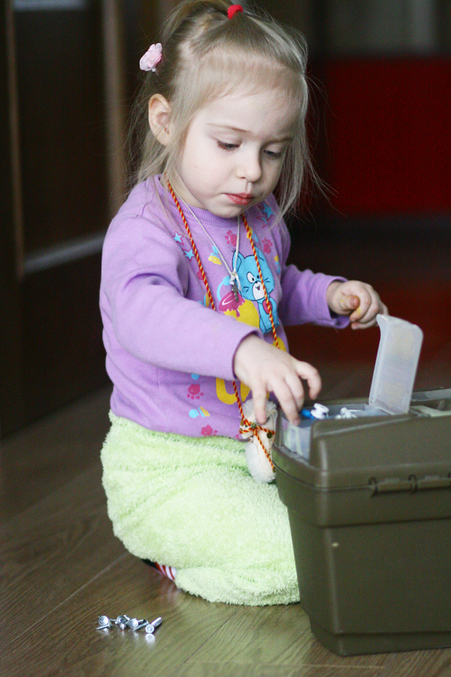 Посмотрели папин ящик: сравнивали гвоздики и шурупы по размеру, выкладывали от большого к маленькому.