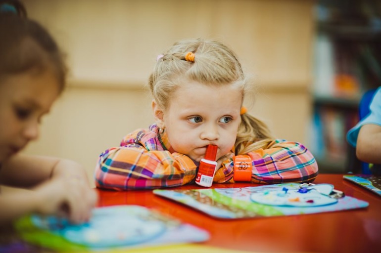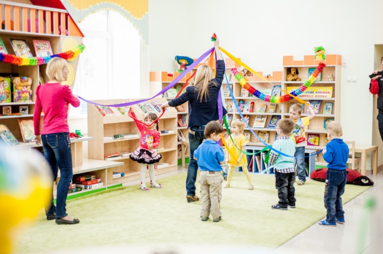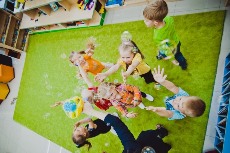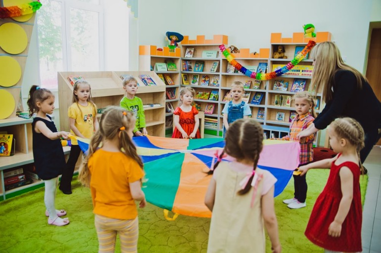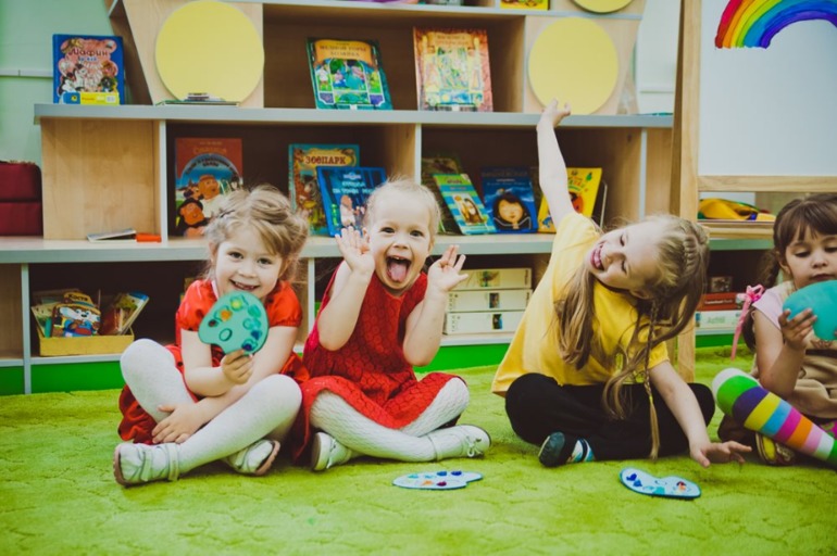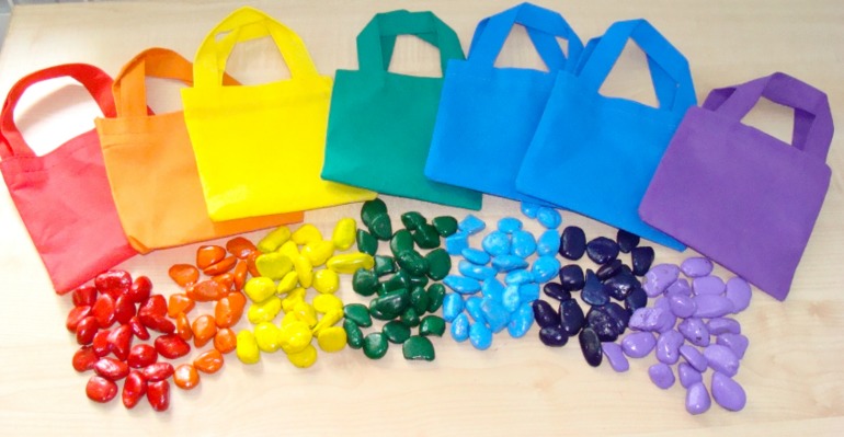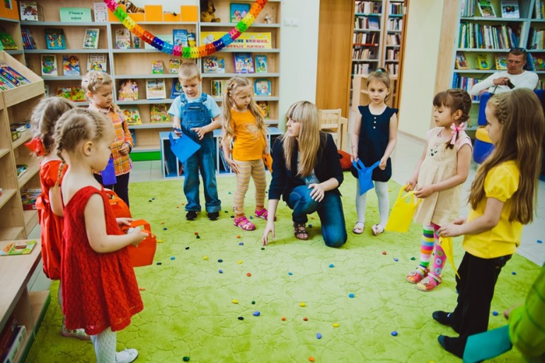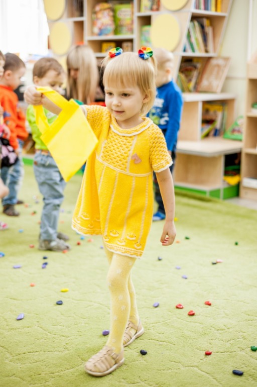 Детям раздали сумочки по цвету одежды и рассыпали по ковру