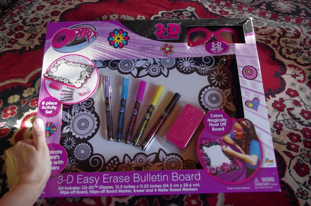 В общем окантовка приклеена с морщинами, криво, бумага отстает от доски местами, вся доска в мелкой черной бархатной пыли. Фломастеры скатываются капельками на доске, черный еле пишет. Не стираются они вообще. Только если пойти взять средство для мытья окон. Внимательно прочитав надпись на коробке, я поняла, что только черный маркер для доски, остальные для рамки. И в чем тогда прикол рисования? Одеть очки и на рамку любоваться?