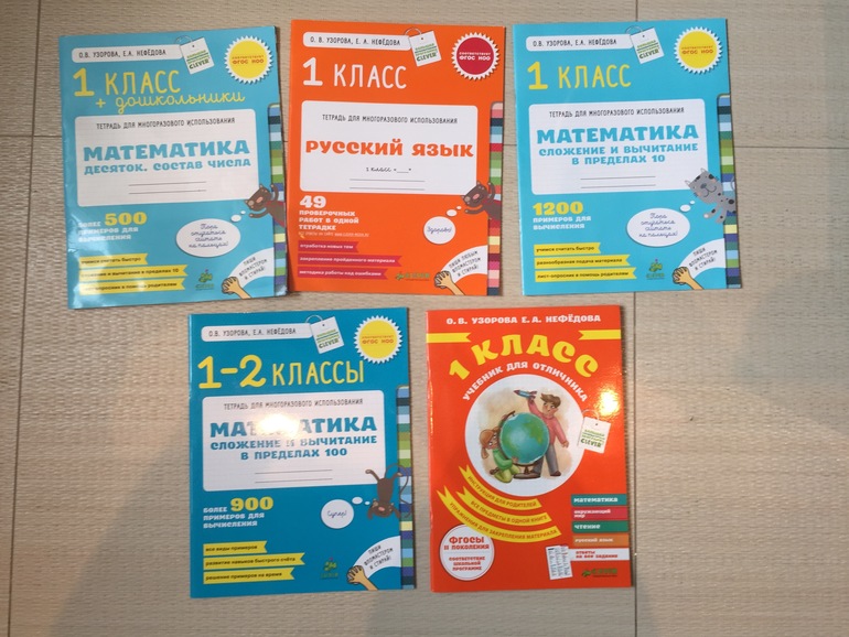 Вот набор пособий для первого класса. 4 многоразовые тетради и одна бумажная ( учебник для отличника, его можно использовать за неделю-другую до школы, чтобы освежить знания)