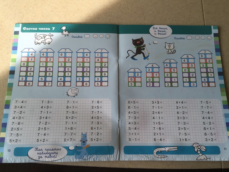 Лучшее пособие для изучения состава числа! Лучшее!!! Можно лет в пять давать, а уж в шесть - уже надо обязательно, чтобы к школе автоматизировалось и осозналось это понятие - состав числа. Тетрадь многоразовая, пишем в ней фломастером и потом все стираем. Рекомендую. 5-15 минут в день, 2-3 раза в неделю и через два месяца дите считало в пределах десятка. А потом все закрепили с помощью второй тетрадки из серии. Нравится оформление, не учебниковое, игровое, с подбадривающими котятами))