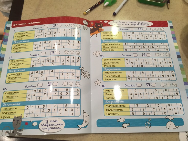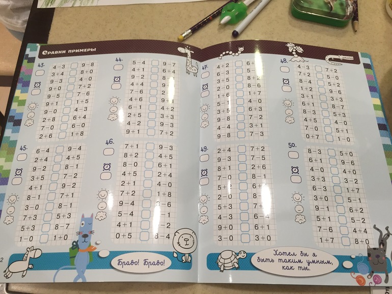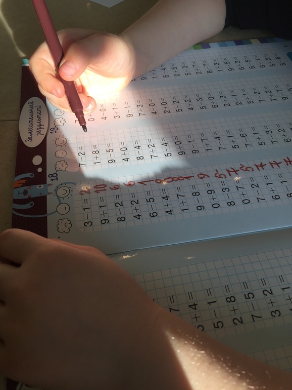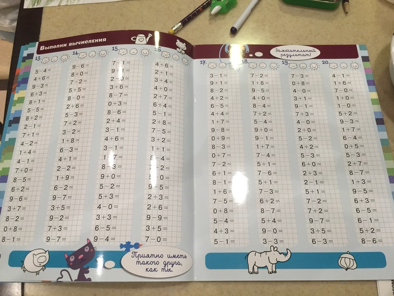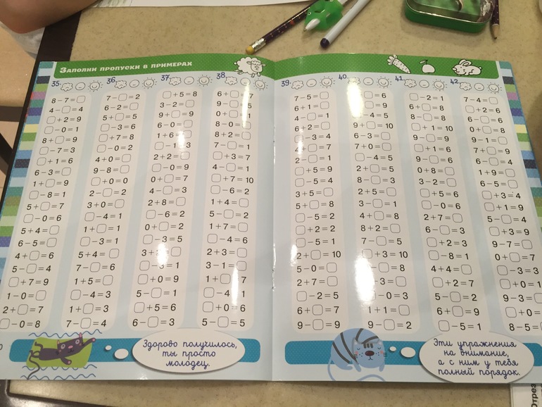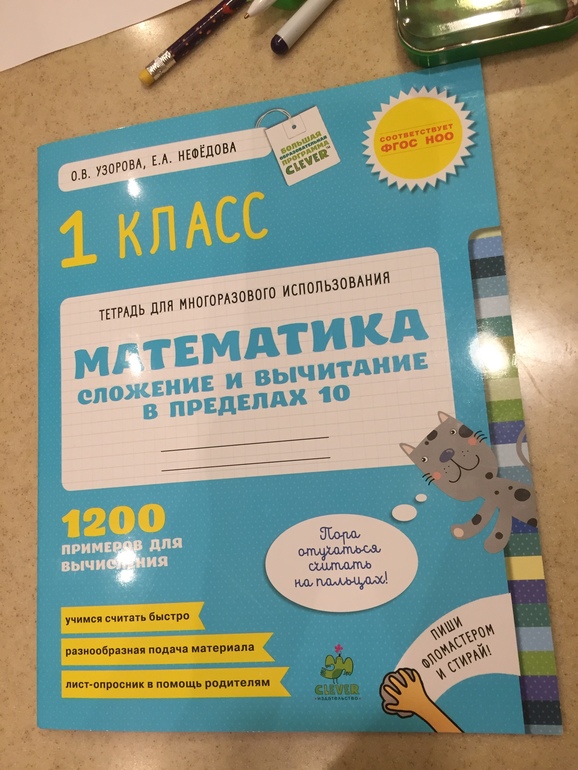 РазвивашкиВторая тетрадка из серии многоразовых тетрадей. Освоив состав числа в первой тетради, перешли к чуть более сложным заданиям на сложение и вычитание в пределах 10. Удобно - порешал, стёр, в следующий раз снова порешал. Фломастер легко стирается чуть влажной салфеткой. Результат я заметила довольно быстро, а мы занимаемся нерегулярно, реже, чем хотелось бы.