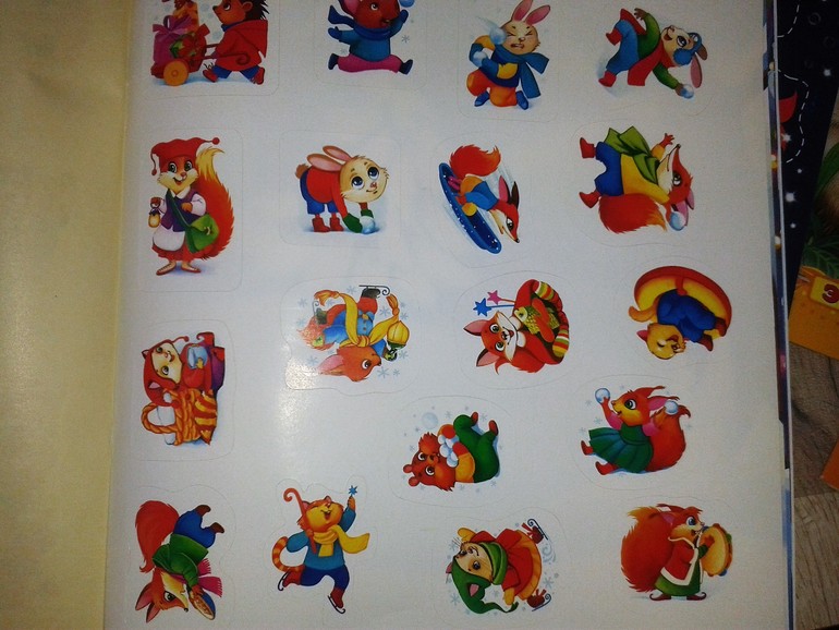 Приобретаю потихоньку задания для адвент календаря. Все дети любят наклейки поэтому книга опять же с наклейками. Что мне понравилось здесь несколько фонов каток, снежная горка, снежная крепость, новогодней ёлка в лесу 2 картинки и просто лес. Наклейки надо приклеить согласно фону.