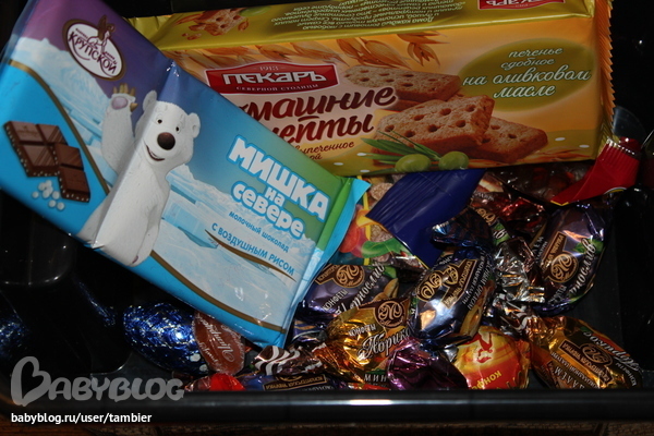 А сколько сладостей! Настеньке это пока нельзя - но я съем с удовольствием! Это все было в чудо-мешке с дедом морозом, но я пересыпала в огромную коробку, чтобы ребенок не добрался.