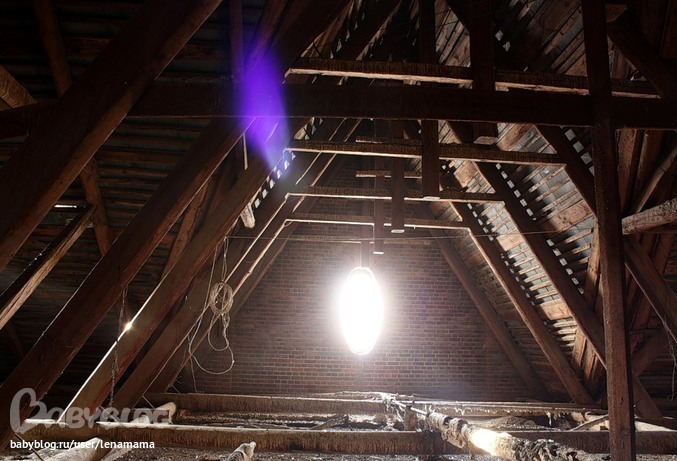 А вот и чердачная центральная часть. Старинное овальное окошко с решеткой снаружи. Свет распространяется по всем направлениям и освещает чердак...