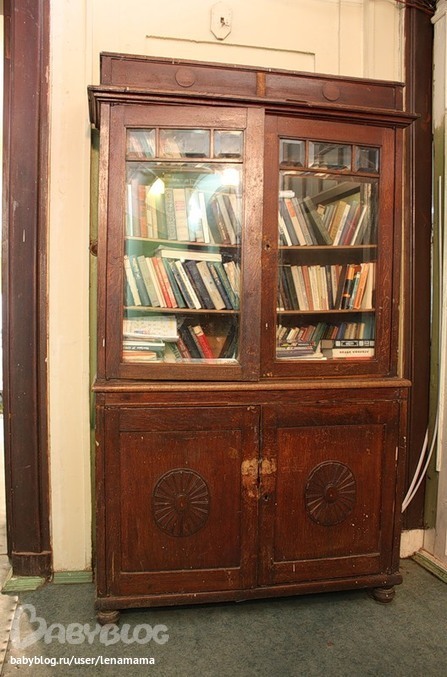 Старинный книжный шкаф, наполненный советской литературой. Здесь больные могут взять себе почитать книжки.