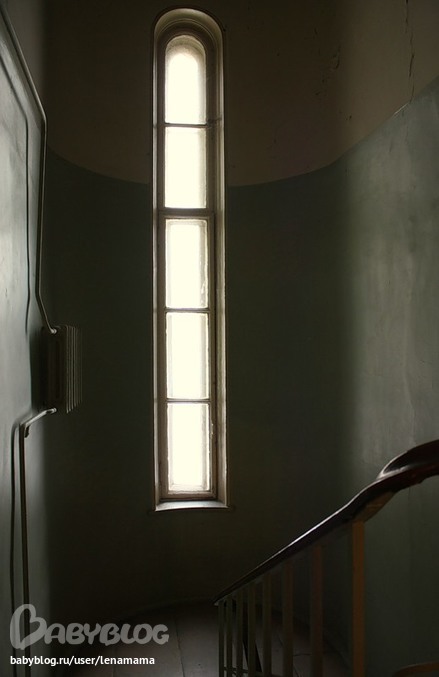 Теперь мы поднимаемся на чердак. Пожалуй, это одна из самых атмосферных частей этого здания. Свет доходит сюда очень слабо, все окна в паутине...Полукруглый свод окошка и еще одна лестница наверх...