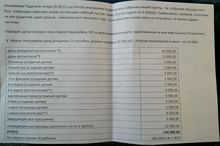 Ну ничего себе....Я даже не так удивлена суммам,как их озвучиванию на бумаге....Понятно,дарим и с большим желанием.но это.... так не делают.И, даже не знаю...в школе поменьше собираем)))) Крутой у Вас садик))))