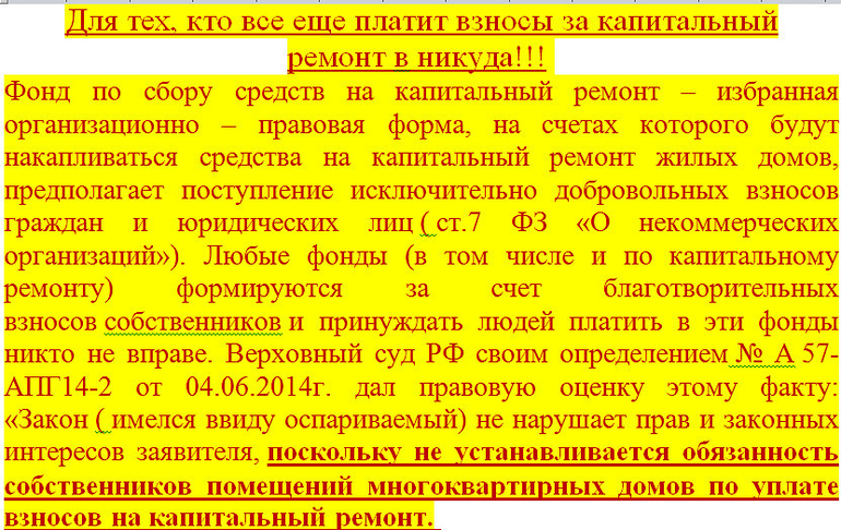 На каком основании нас заставляют платить фонду? Законом предусмотрены только добровольные взносы. Тем более денежные средства, переданные фонду, будут являться собственностью фонда, и собственник квартиры не сможет далее на них претендовать, даже если фонд не будет ремонтировать дома. Фонд не наделен полномочиями взыскивать денежные взносы.