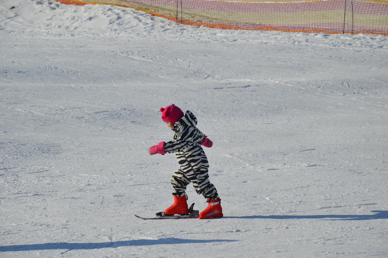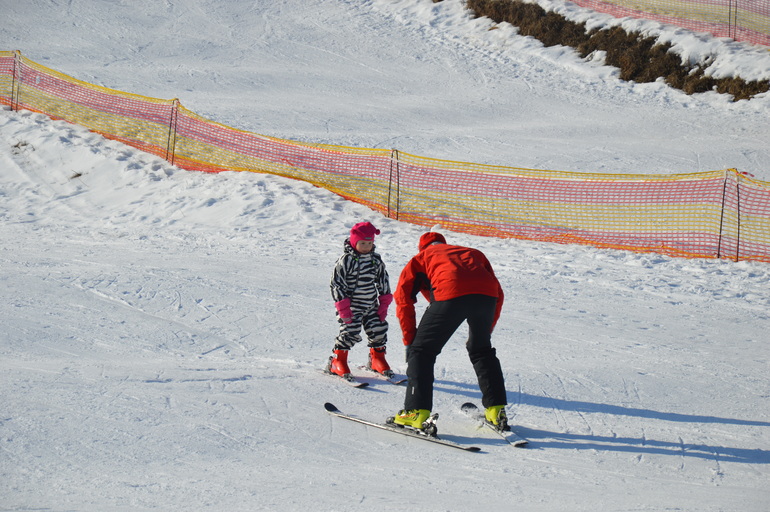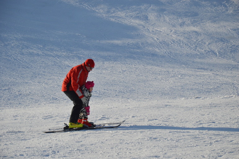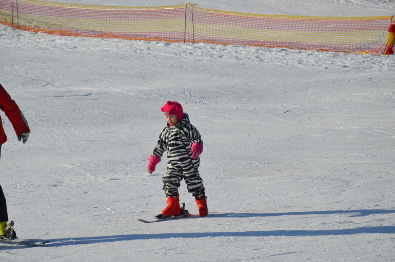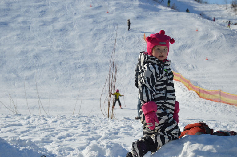 Спуски довольно экстремальные, поэтому для новичков и маленьких детей разумней начинать в другом месте с более пологими и детскими склонами, как мне объяснил инструктор. Но так как была задача просто показать ребенку, что это и научить элементарно стоять\ходить на лыжах и съезжать с совсем небольших склонов, не падая-нам подошло и здесь.