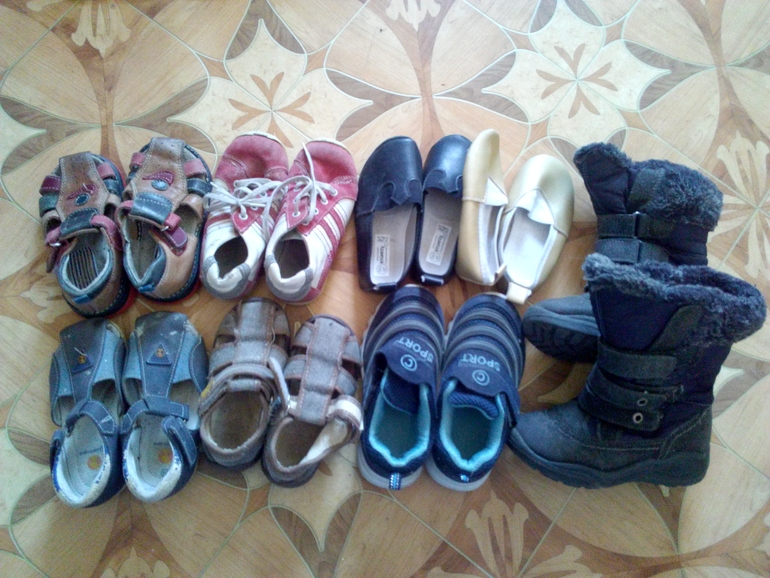 Обувь: в неважном состоянии - сандали, кросовки, чешки, зимние сапоги все noname, размеры не везде написаны 24-27, на вид 24-25. 2-4 года.