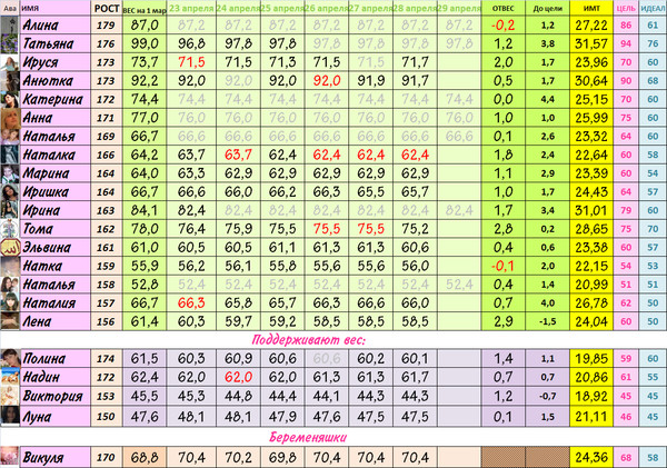 всем привет! что-то наша табличка зияет пятнами пропавших девчонок... Модераторы, надо что-то делать. Я вернусь к отчетам 1 мая с тем весом, какой будет на тот момент(((