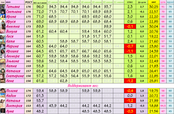 привет, у меня 51.2 (-500). С утра - тушеная говядина с овощами, пол картофелины отварной, обед - окрошка, ужина не было, была не дома, на ночь наелась (23 часа) малины и крыжовника 400-500 г. думала наоборот будет ++++