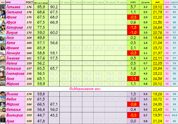 Вика,перенеси меня в таблице в "поддерживающие вес".Пока так....худеть больше не хочу,но животик надо еще убрать,тут мне диета не поможет,спорт нужен...