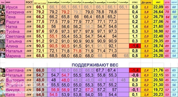 в нашей табличке небольшие изменения, в разделе поддержание веса, нормальное колебание веса - или + 1кг, поэтому те которые набирают до 1кг отмечены розовым цветом, чтоб просто обратили внимание и не уходили в красный цвет, в перебор.