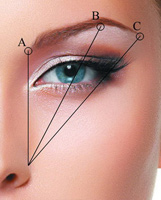 Линия В – показывает нам где должно быть место изгиба, или наивысшая точка брови. Для этого с помощью карандаша проложи линию от крыла носа по касательной через зрачок. Если же у тебя излом брови не ярко выражен от природы, тогда для коррекции формы бровей лучше обратиться к визажисту с опытом, или же оставить плавную форму.