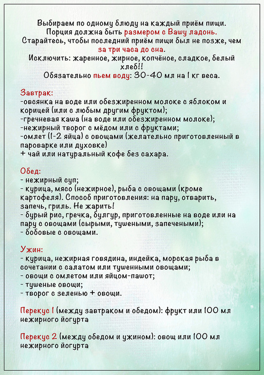З.каша гречка,сырП.чай,творогО.паровая куриная котлета,рис дикий,помидор,огурецП.кефир,галет из овсаУ.Арбуз