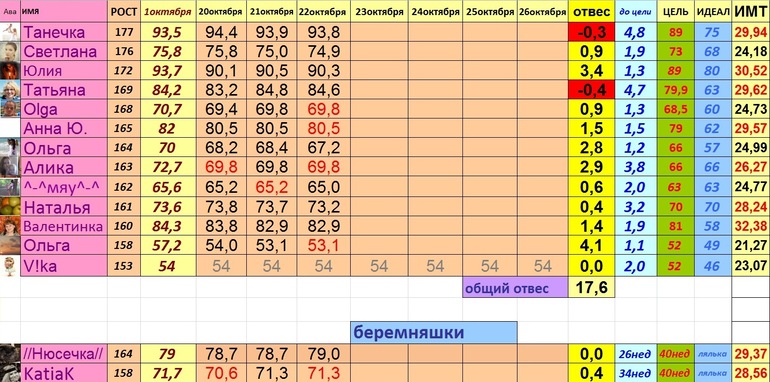 приыет! что-то у меня вчера сообщение не отправилось,а я не проверила. вчера 80.3(-200), сегодня 80,1( еще-200) с питанием косячила,вчера маенький праздник был с алкоголем ((( и на ночь наелась((( думала,что опять 81 с хвостом бужет