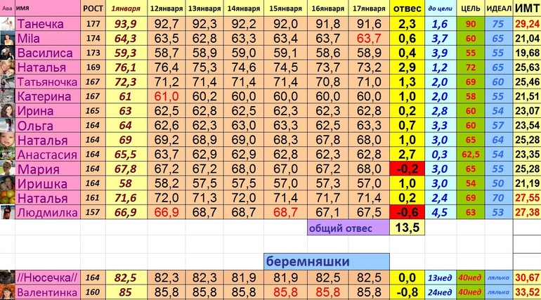 Как нас много в таблице! Вау! И какой отвесище, несмотря на красные квадраты. Супер!А я чего-то не отвешиваю(((( Вес 60,2 (+200) после выходных.З — омлет с сыром, кофе с молоком, 2 квадратика темного шоколада 72%О — курица, запеченая в рукаве (съела бедро без кожи), гречка, 2 рюмки маминой клюковкиУ — обезжиренный творогСегодня разгружаюсь на твороге 5%...вообще я за все это время разгружалась наверное пару раз всего. Посмотрим, как получится (хотя творог сытный, на нем не сложно сидеть) и какой отвес даст.