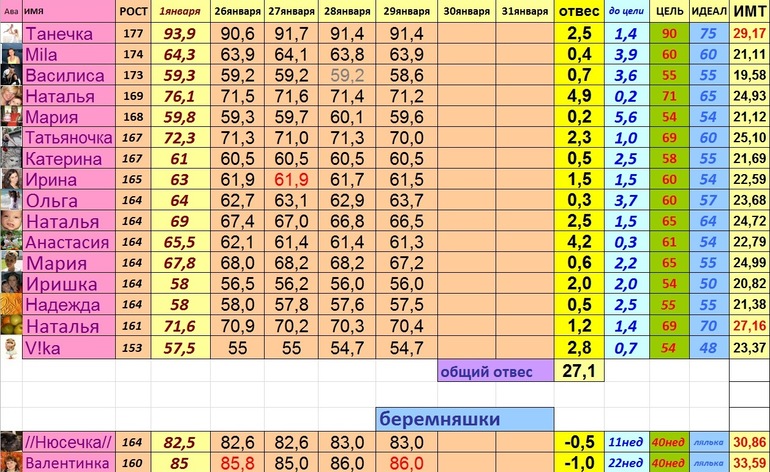 Всем привет!вес 61.3 я на месте. Минус хороший был только после разгруз очного дня((( З: каша кукурузная на воде без масла, сахара, чай о: суп гороховый (без картофеля), пару ложек салата из свежей капусты, кофе с кусочком сахара у: котлета и столовая ложка квашенной капусты, мне она показалась очень соленой т. К. Солю очень мало еду. Были в гостях у бабушки мужа, это самое безобидное, что было из еды)))поздний ужин: стакан кефира перекусы:яблоко, кефир. Вообще, вторую неделя почти не бывает хороших отвесиков, только вот разгруз. Видимо, нужен спорт или еще что-то, не правильно делаю. Хотя цель свою перевыполнили)))это радует!она, у меня ,кстати, 62.5 была. Это специально изменили её в таблице, чтобы было к чему стремиться?или случайно?всем доброго дня!!!!!!
