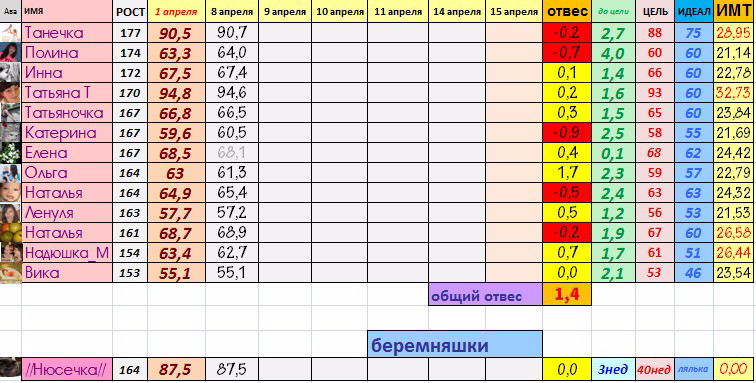 Привет! Вес 96,6 вроде на месте. Простите, что отчитываюсь через раз, после Пасхи исправлюсь. Меню писать даже не хочу, ем мало, но правильного питания не получается пока.