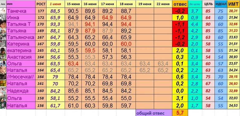 Девочки, доброе утро! Примите меня))) очень хочу к августу-сентябрю похудеть до 58 кг! Рост 171, вес месяц назад был о ужас!!! 70 кг, потом 68. Самая проблемная зона живот. Сейчас стараюсь придерживаться пп. Наверно вес стал поменьше, но нет весов, к сожалению. На следующей неделе постараюсь их приобрести и отписаться!
